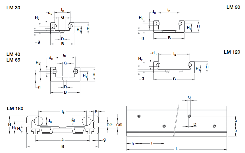 6、LM導(dǎo)軌截面尺寸有30、40、65、90、120、180規(guī)格。